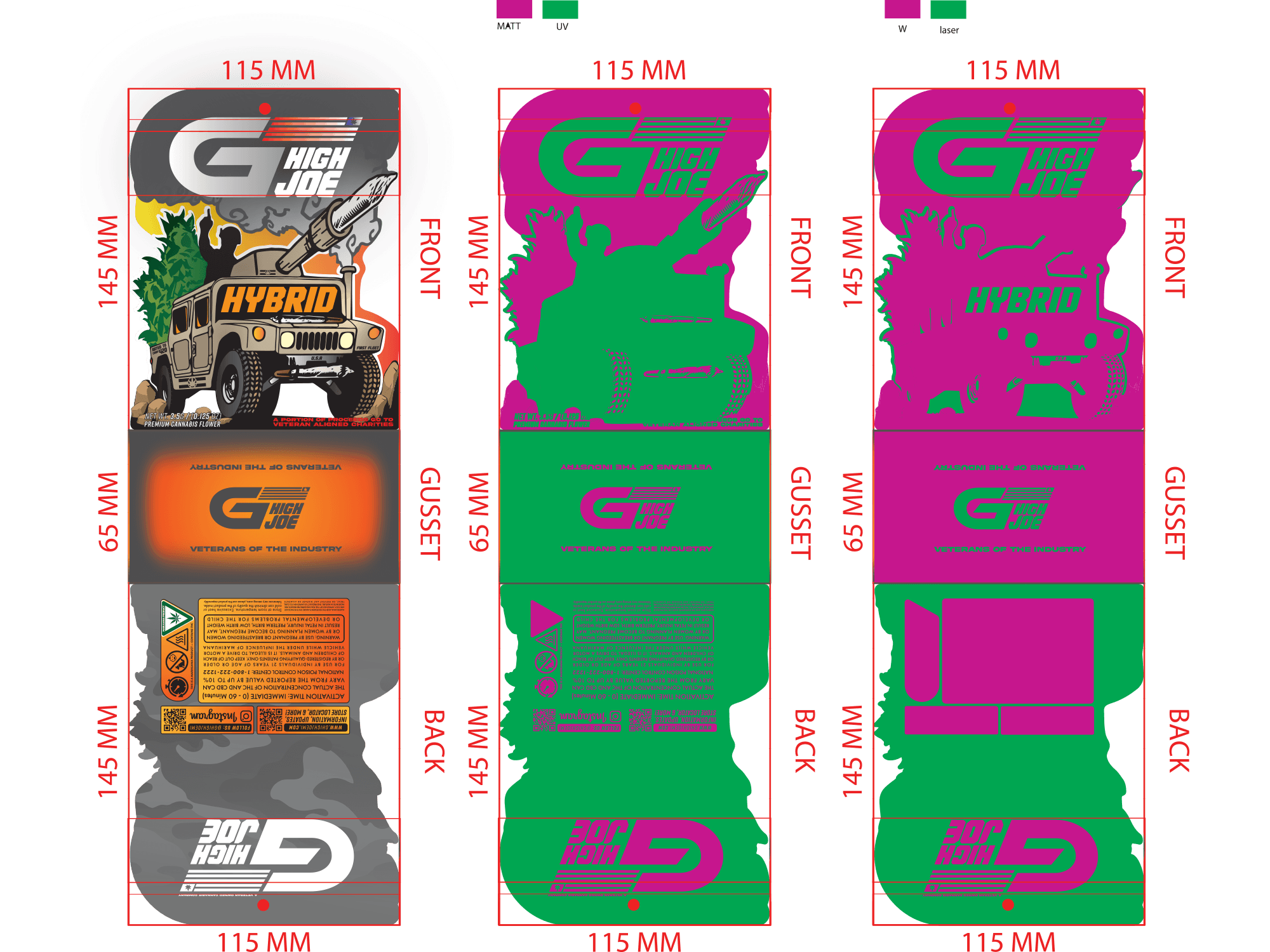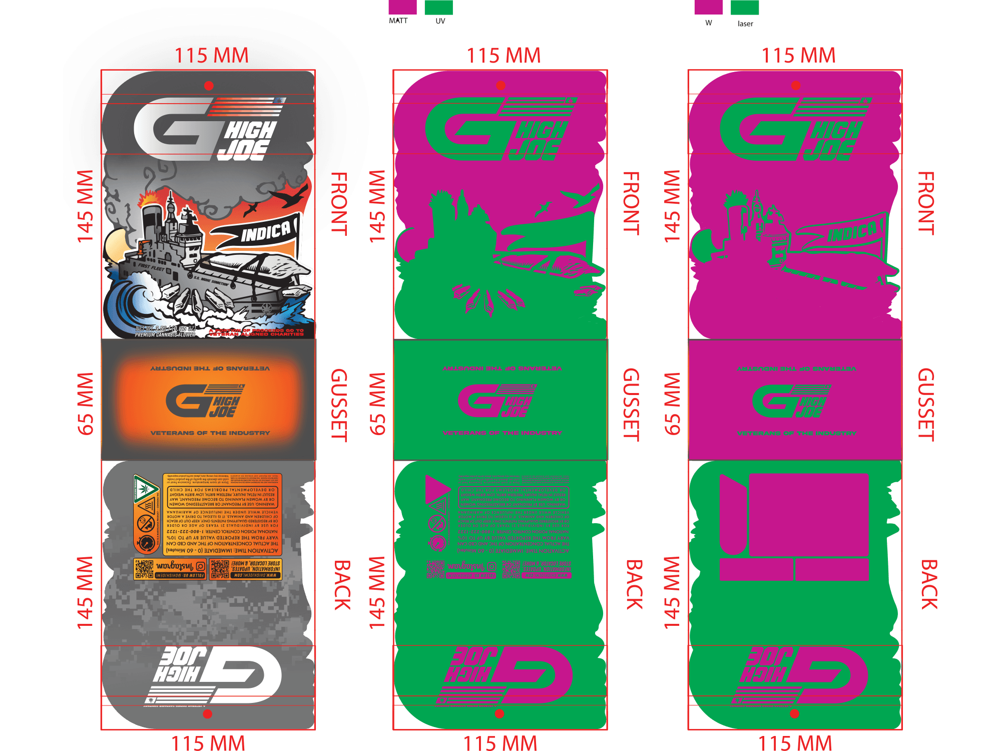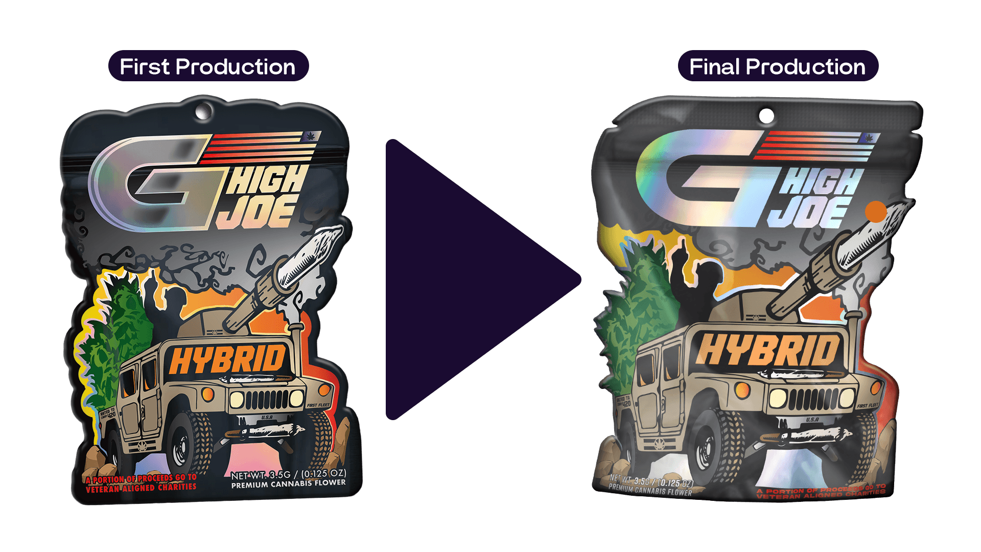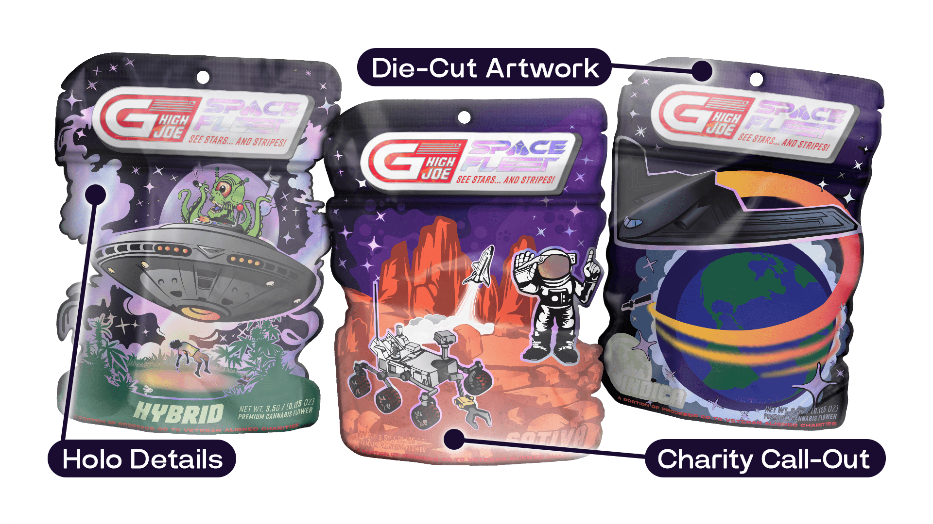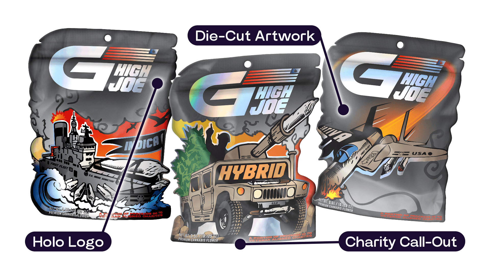 G High Joe's launch included 2 separate product lines, both featuring unique and detailed designs. Each line had 3 separate variations for Hybrid, Indica, and Sativa. These vector-based designs were created using Adobe Illustrator and were produced into die-cut mylar packages, as well as being used in supporting media. Custom shaped die-cut packages are often seen as a premium option in retail (die-cuts can enhance the illustrative or unique features of a design). When new retailers would begin to carry GHJ products, they would say the detailed packaging and GHJ's ability to draw an eye were a major factor in their decision to carry and sell the brand at their stores.