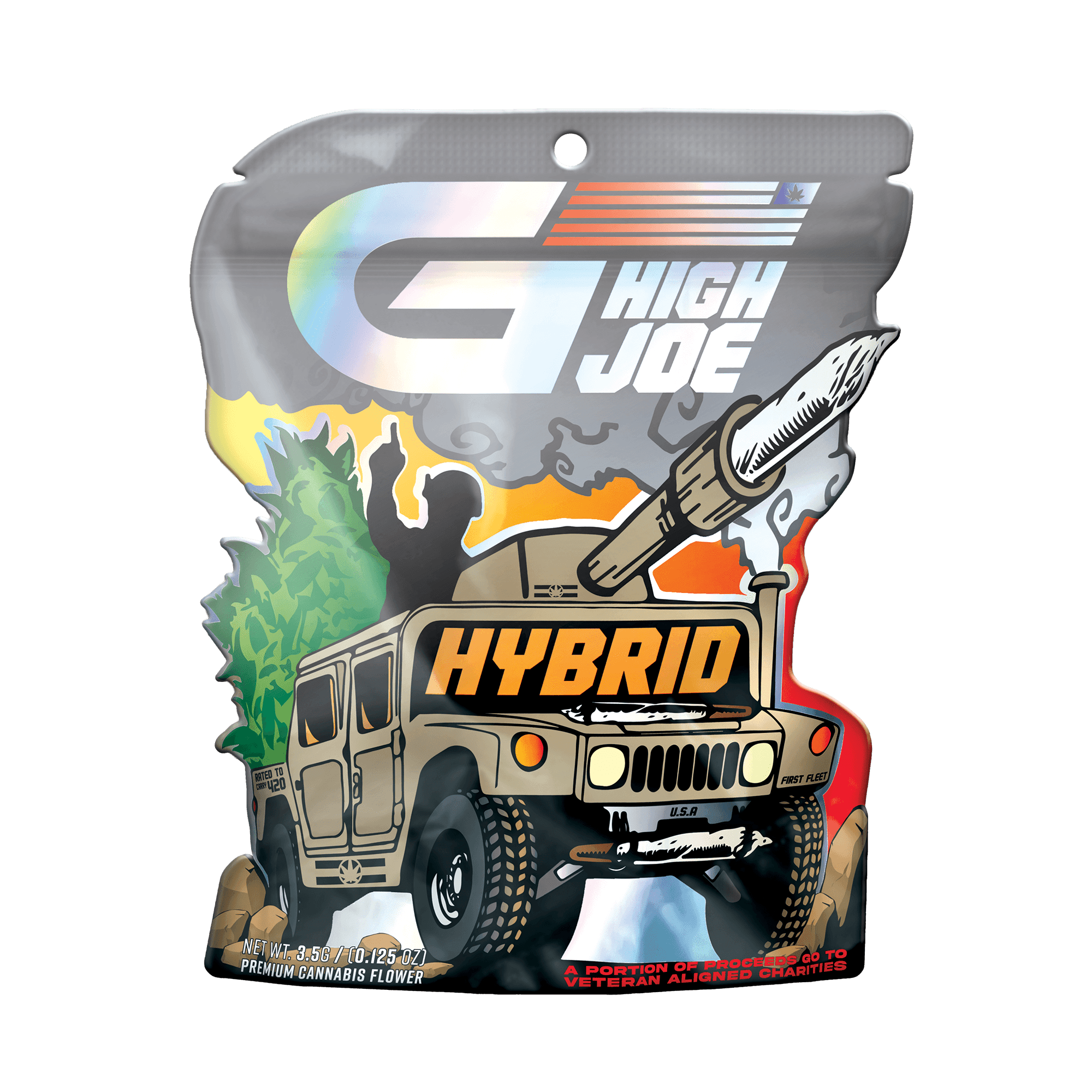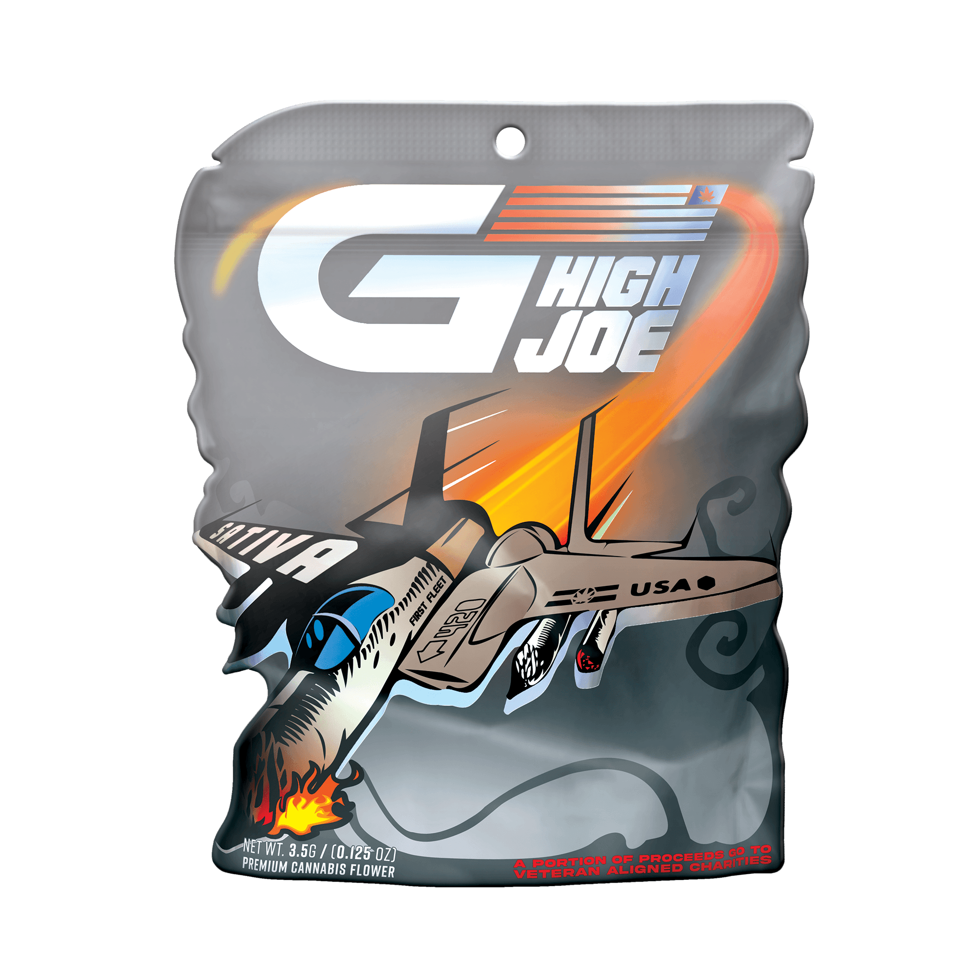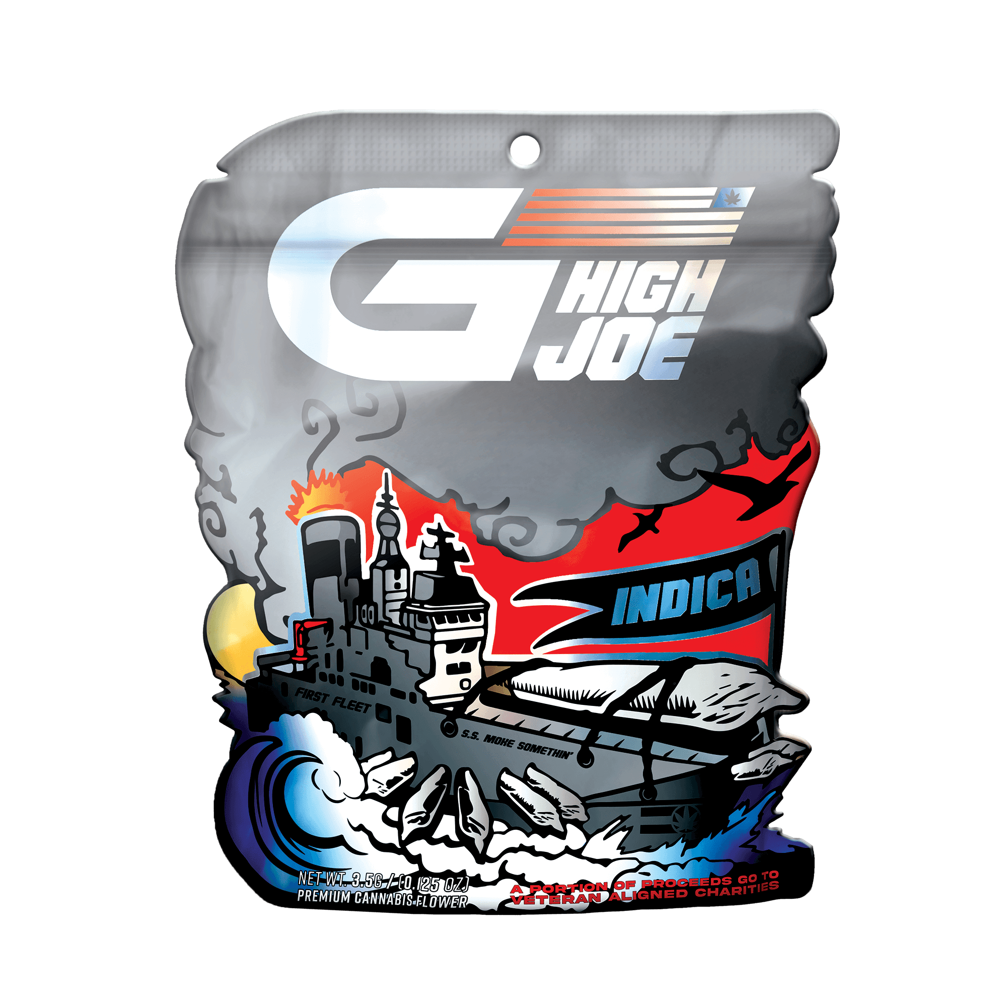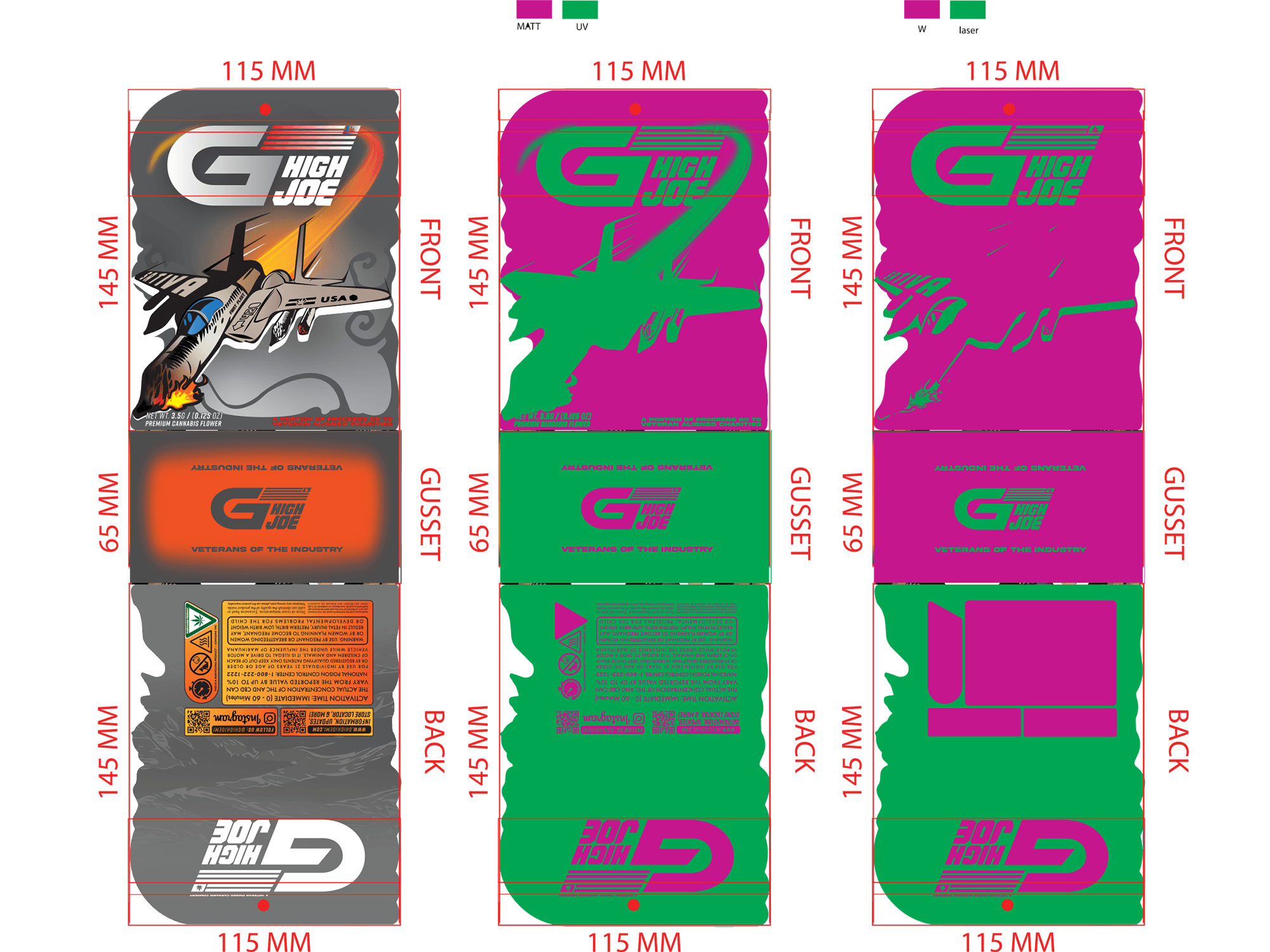 G High Joe's launch included 2 separate product lines, both featuring unique and detailed designs. Each line had 3 separate variations for Hybrid, Indica, and Sativa. These vector-based designs were created using Adobe Illustrator and were produced into die-cut mylar packages, as well as being used in supporting media. Custom shaped die-cut packages are often seen as a premium option in retail (die-cuts can enhance the illustrative or unique features of a design). When new retailers would begin to carry GHJ products, they would say the detailed packaging and GHJ's ability to draw an eye were a major factor in their decision to carry and sell the brand at their stores.
