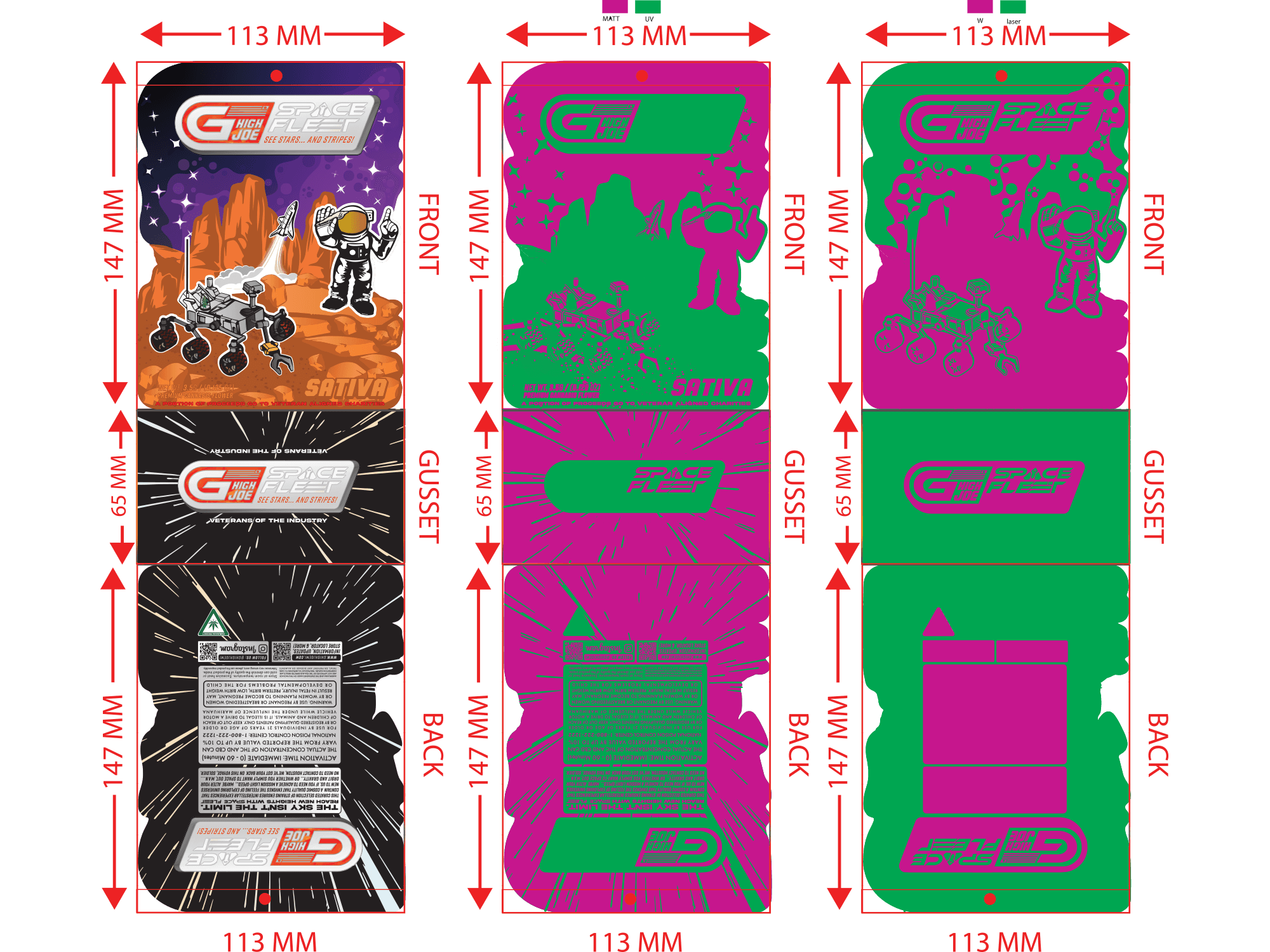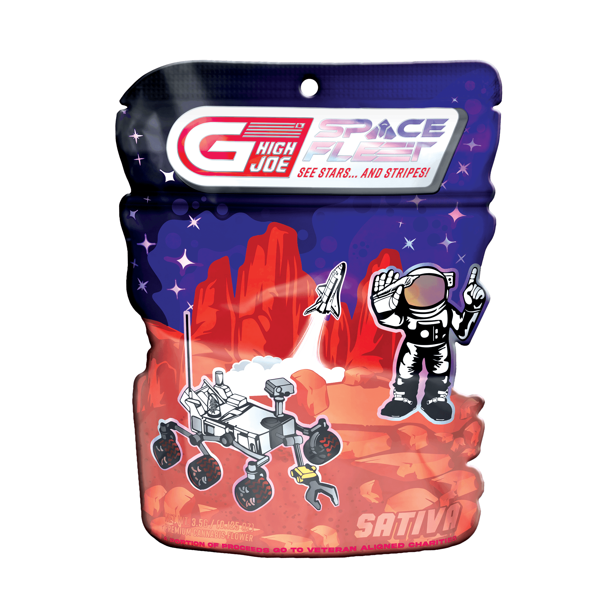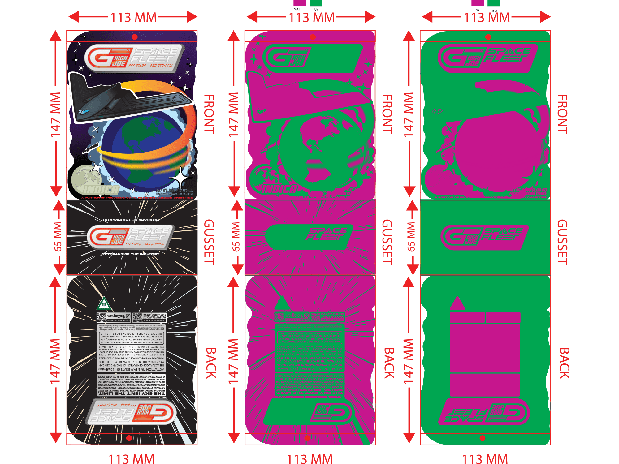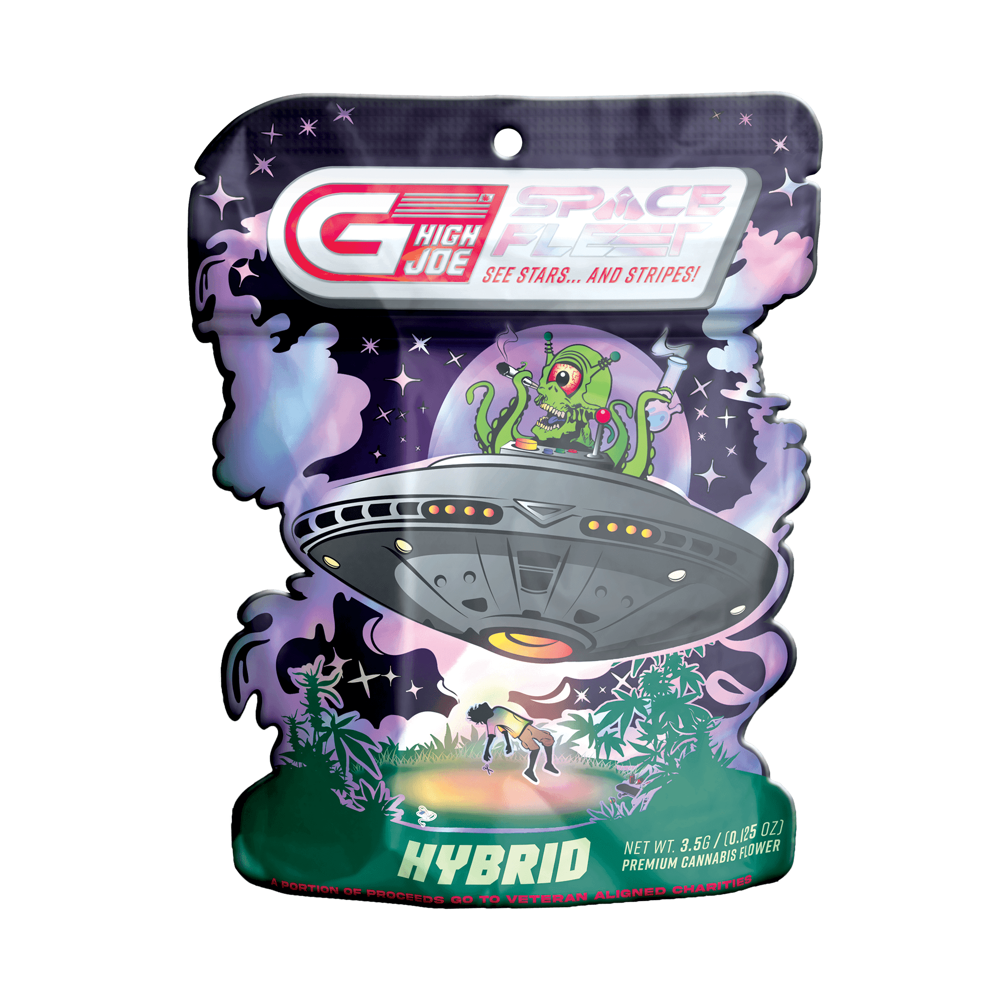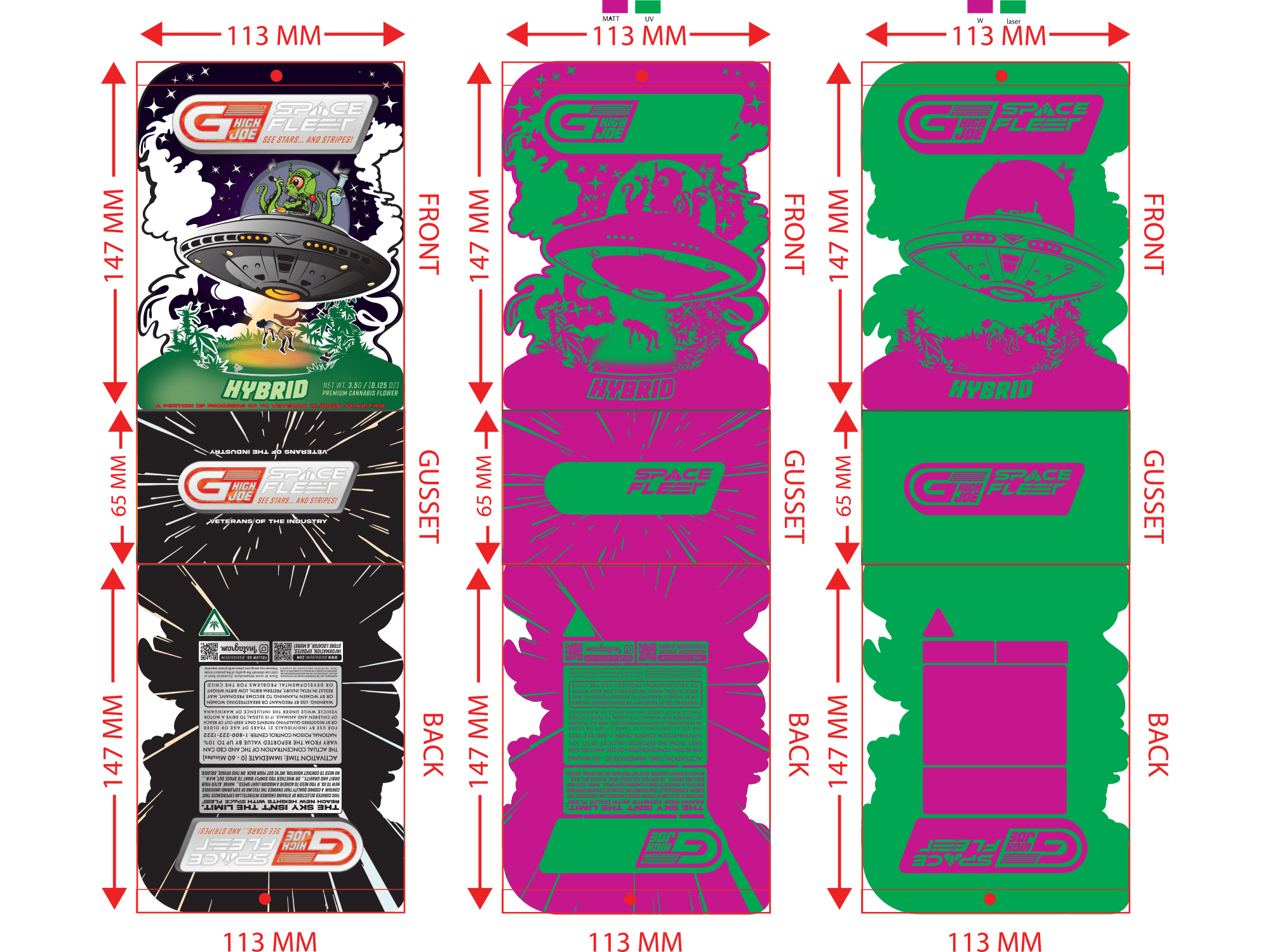 G High Joe's launch included 2 separate product lines, both featuring unique and detailed designs. Each line had 3 separate variations for Hybrid, Indica, and Sativa. These vector-based designs were created using Adobe Illustrator and were produced into die-cut mylar packages, as well as being used in supporting media. Custom shaped die-cut packages are often seen as a premium option in retail (die-cuts can enhance the illustrative or unique features of a design). When new retailers would begin to carry GHJ products, they would say the detailed packaging and GHJ's ability to draw an eye were a major factor in their decision to carry and sell the brand at their stores.