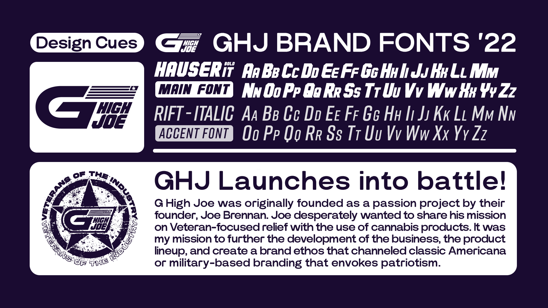 I developed the brand concept and visual identity for G High Joe with the guidance of their founder, Joe Brennan. Joe is a US veteran who founded his company with the purpose of giving back and supporting veterans in search of relief and wellness. I created logos, packaging, and supporting materials to launch and elevate his passion project into a retail brand. The success to follow would allow Joe's message to reach a wider audience and raise their profit margins… allowing the company to create jobs and give back to veterans and the charities that support them.